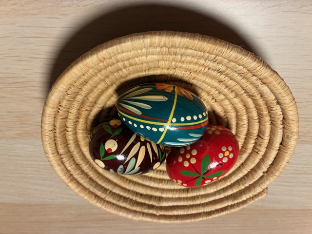 今日はここに、ウクライナのイースターエッグを持ってきました。イースターはキリストの復活を祝う宗教的な行事ですが、寒い冬のあと、春の訪れをお祝いするお祭りでもあります。卵が復活のシンボルになっていて、ウクライナでは、綺麗な模様を卵に描いて祝います。伝統的には生の卵を使って作るそうですが、これは、木で作った卵に絵を描いたものです。先ほど言ったようにトロントでわたしが住んでいたのが、ウクライナから来た人たちが多い地域だったので、装飾品として、近所のお土産屋さんで売られていました。ウクライナのイースターエッグは地方ごとに模様も違っていて、デザインにはひとつひとつ意味があるそうです。こちらに置きますのであとでご覧になってください。