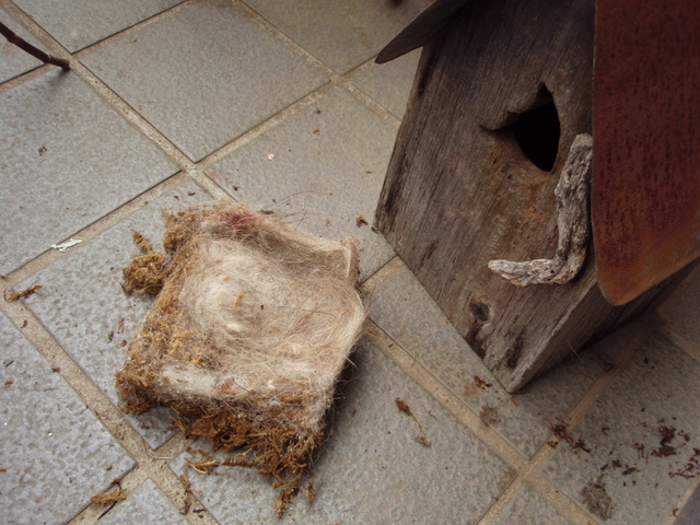 それ以上に驚いたのは、床底の板を外したときです。巣箱の底に、厚さが4、5センチぐらいもある寝床がこしらえてありました。下の方は細かな杉の枯れ葉のようなものが幾重にもかさねられ、そして、ひな鳥が直接触れるその上の部分は、ふわふわの羽毛(?)が敷いてありました。さわってみると、すごく気持ちの良い寝床でした。