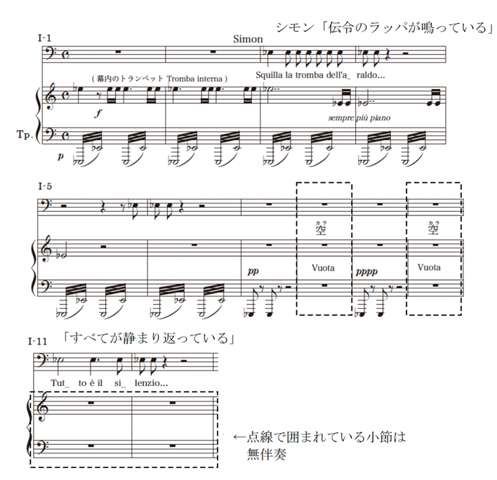 ひとつは、オーケストラと歌唱の両方の音楽が停止する、完全な無音の状態である。それが歌手の声によって破られるとき、無音は意味のある「沈黙」となる。《シモン・ボッカネグラ》(1881)の第1幕11場には、その典型的な例が見られる(譜例1)。