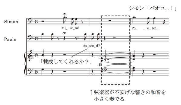 この場面では、舞台上の人物たちは動きをとめ、幕内に設定された「外」の様子に耳を澄ませる。シモンの「伝令のラッパが鳴っている」という言葉だけが、舞台上の人々と観客に、外の状況を伝える手掛かりとなる。舞台の外の出来事は視覚では示されず、聴覚による想像に委ねられるのである。やがて音は減衰し、ついには完全な無音の小節(譜例中の点線部分)へと至る。シモンが「すべてが静まり返っている」と呟くとき、舞台上の登場人物と観客は、まさに同じ「無音」を共有しているのである[6]。